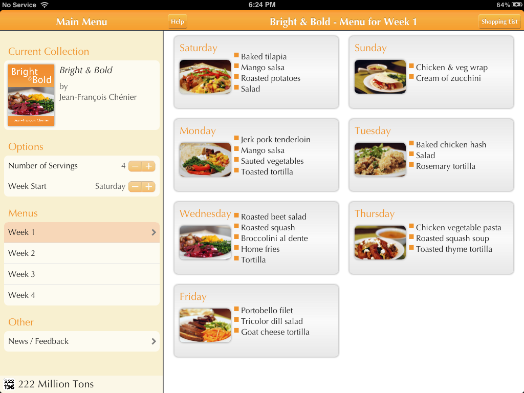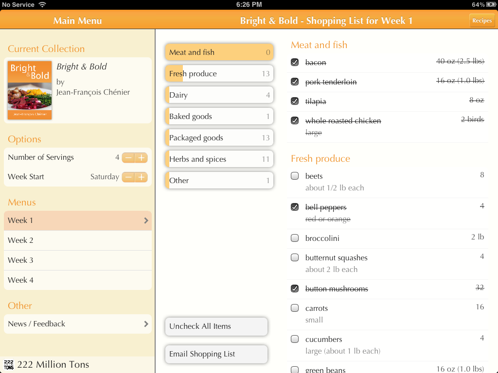 No one wants to waste food, but how does one person get through a bunch of celery before it goes limp without getting sick of celery? It was that question which inspired us to develop the 222 million tons platform for the iPad, and to start developing one-week menus and shopping lists that allow single people, couples and small families to enjoy variety in their diets, without wasting fresh food.